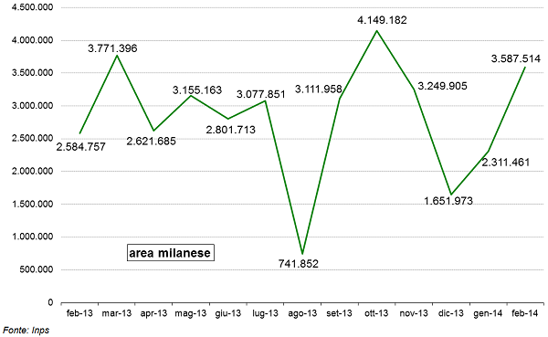 A febbraio 2014 prosegue la crescita della CIG Straordinaria nell'area milanese. Le ore autorizzate hanno superato i 3,5 milioni di ore e sono risultate in crescita sia rispetto a gennaio 2014 (+55%) sia rispetto a febbraio 2013 (+39%). A livello nazionale, le stesse variazioni sono state pari rispettivamente pari a -11% (febbraio 2014 sul mese precedente) e +17% (febbraio 2014 sullo stesso mese del 2013).