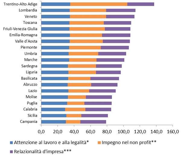 Come per le imprese, anche per i territori si può valutare la capacità di coesione: considerando l'attenzione al lavoro e alla legalità, la presenza della popolazione nel non profit e il livello di relazionalità delle imprese le regioni più coesive sono il Trentino Alto-Adige, seguito dalla Lombardia, dal Veneto, dalla Toscana e dal Friuli Venezia Giulia.