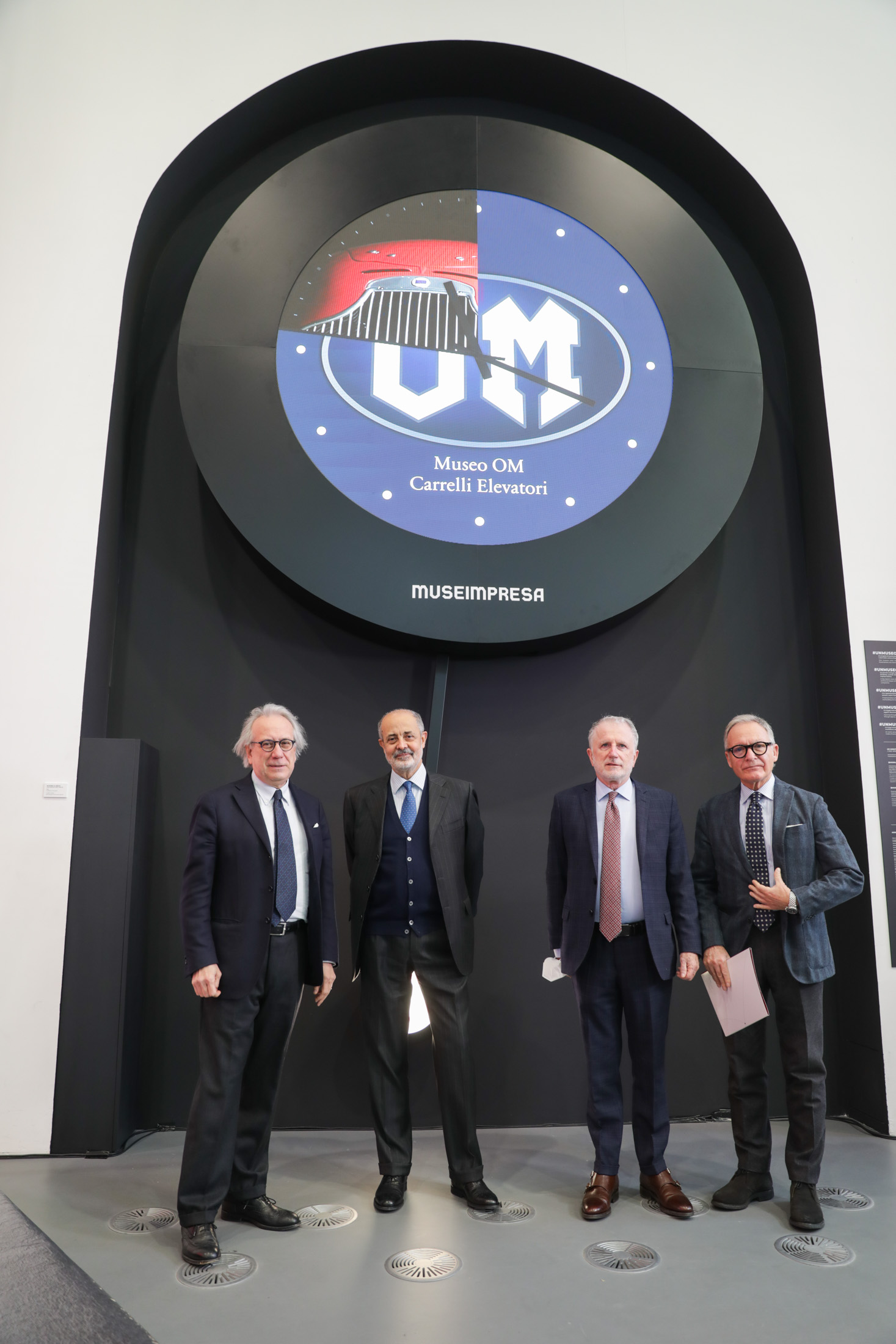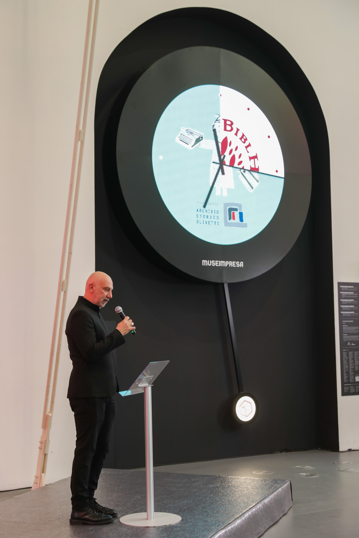 Ogni museo è rappresentato da un’immagine identitaria che si alterna, ogni minuto, a quelle degli altri musei e archivi sul quadrante di un grande orologio, metafora della stratificazione nel tempo della cultura di impresa. Il movimento della lancetta dei secondi compone ogni volta un quadrante diverso. Il pendolo, con la sua scansione ritmica, è la rappresentazione simbolica di passato, presente, futuro, e racconta della capacità delle aziende di guardare alla propria storia, di operare nell’oggi e di volgere lo sguardo al futuro in un processo di continua innovazione.