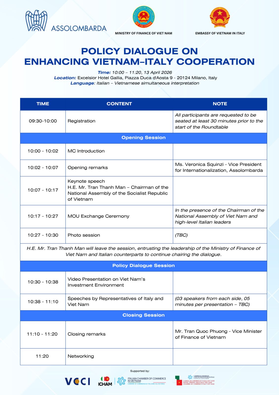 Il Ministero delle Finanze del Vietnam e l’Ambasciata del Vietnam in Italia organizzano, in collaborazione con Assolombarda e con il supporto di VCCI, ICHAM e CCIV, il Policy Dialogue on Enhancing Vietnam-Italy Cooperation, che si terrà a Milano il 13 aprile, presso l’Excelsior Hotel Gallia.